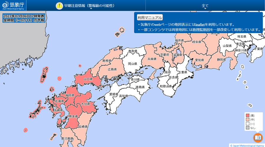 小笠原さんは「梅雨末期は、明日だけじゃなく、数日先の予報もチェックしたい」と呼びかける。週間の天気や雨量の予報に加え、気象庁が5日先までの警報級発表の可能性を示す「早期注意情報」も薦める。専用サイトで「中」「高」の2段階で示される。「高」は警報発表の可能性が高く、「中」でも警報級の現象になりうるとして警戒を促す。毎日午前5時、午前11時、午後5時の定時発表のほか、気象警報・注意報の発表に応じて随時更新する。