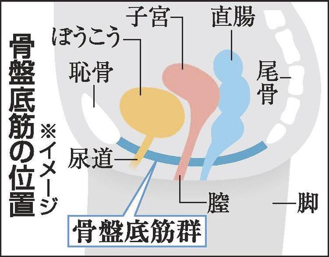 骨盤底筋群は、骨盤の底にある筋肉の「ガードル」のような存在だ。臓器を支え、体幹を安定させたり排せつをコントロールしたりする。女性の骨盤底筋群には穴が三つ(肛門、腟(ちつ)、尿道)あり、男性に比べると横長で広く、腸、ぼうこうに加えて子宮と卵巣と支えるものが多く負担も大きい。