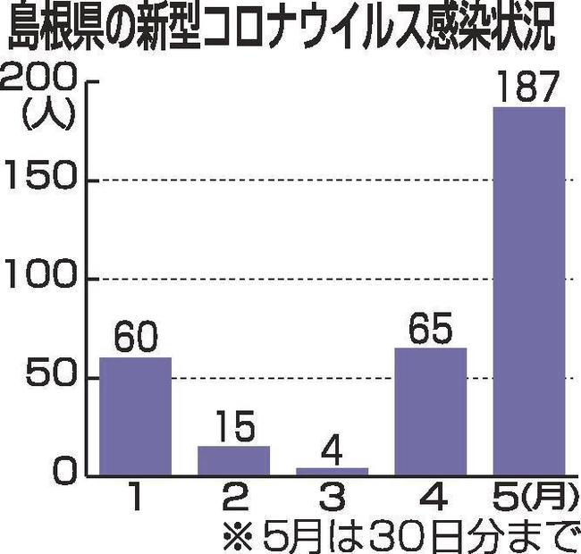 島根県は31日、県内の新型コロナウイルスの新規感染者(30日検査分)が約1カ月ぶりにゼロだったと発表した。5月は30日検査分まででクラスター(感染者集団)が計6件発生し、感染者は月別で最多の187人を数え、宿泊療養施設の運用も開始。県は予断を許さない状況が続いてるとして、感染予防の徹底を呼び掛けている。