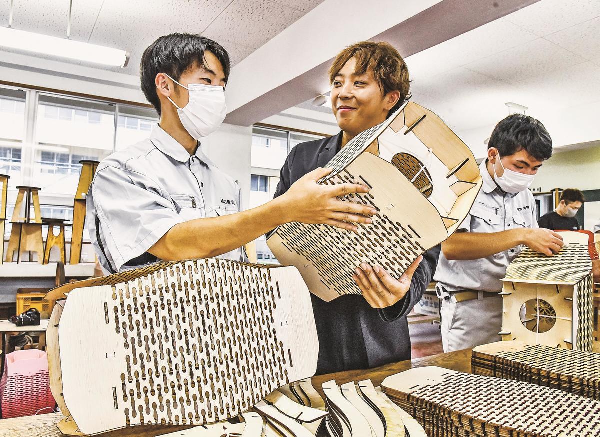 江津市最大の夏祭り「江の川祭」の新たな見どころをつくろうと、江津工業高校(江津市江津町)の生徒が木製ちょうちんを製作した。内部にLED電球を入れ祭り前日の8月15日、当日の16日に会場となる江津市江津町のパレットごうつの屋外エリアで点灯させるほか、恒例の市民パレードでは参加者に持ち歩いてもらい、光で祭りを彩る。 (村上栄太郎)