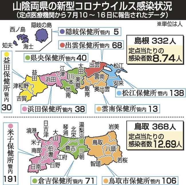 島根、鳥取両県が19日、定点医療機関で10~16日に報告された新型コロナウイルスの感染者は島根332人、鳥取368人で、1定点当たりは島根8・74人、鳥取12・69人だったと発表した。前週比で島根1・95人、鳥取0・72人、それぞれ増加。島根の保健所管内別の定点当たりの感染者は県央が13・33人、松江が12・55人と二つの管内で10人を超えており、拡大が目立っている。