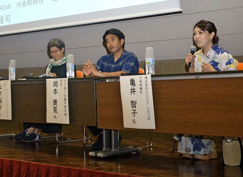 官民代表の5人がパネリストを務め、元町通り商店街でデザイン会社「GOOD GROW(グッドグロウ)」を営む亀井智子社長は昨年4月、空き店舗を改修して雑貨、菓子販売などの複合施設をオープン。近くに飲食店や美容院が新たに開店し「若い世代と連携し商店街に立ち寄る動機付けをつくっていきたい」と意気込んだ。
