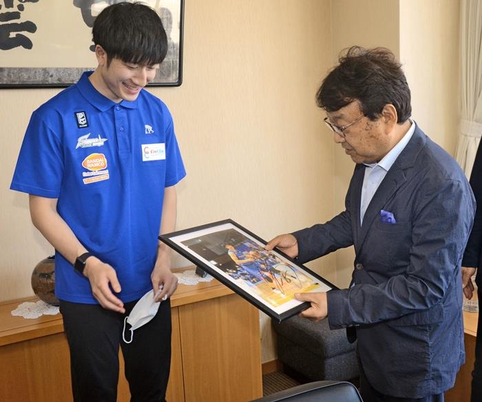 また、来季の目標は35~45勝を挙げ、Bリーグ王者を決めるプレーオフのチャンピオンシップに出場することとし、「たくさんの人に島根のバスケットボールを楽しんでもらえるよう頑張りたい」と意気込み、白濱選手が松尾倫男社長に自身のサインが入った写真を贈った。(景山達登)