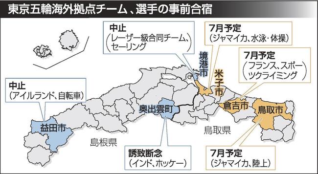 山陰両県では、インドのホッケー代表を受け入れる方針だった島根県奥出雲町が3月に誘致を断念。ヨット・セーリング合同チームの合宿が決まっていた境港市では、チーム側の意向で5月に中止となった。