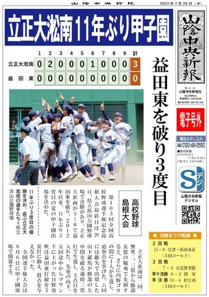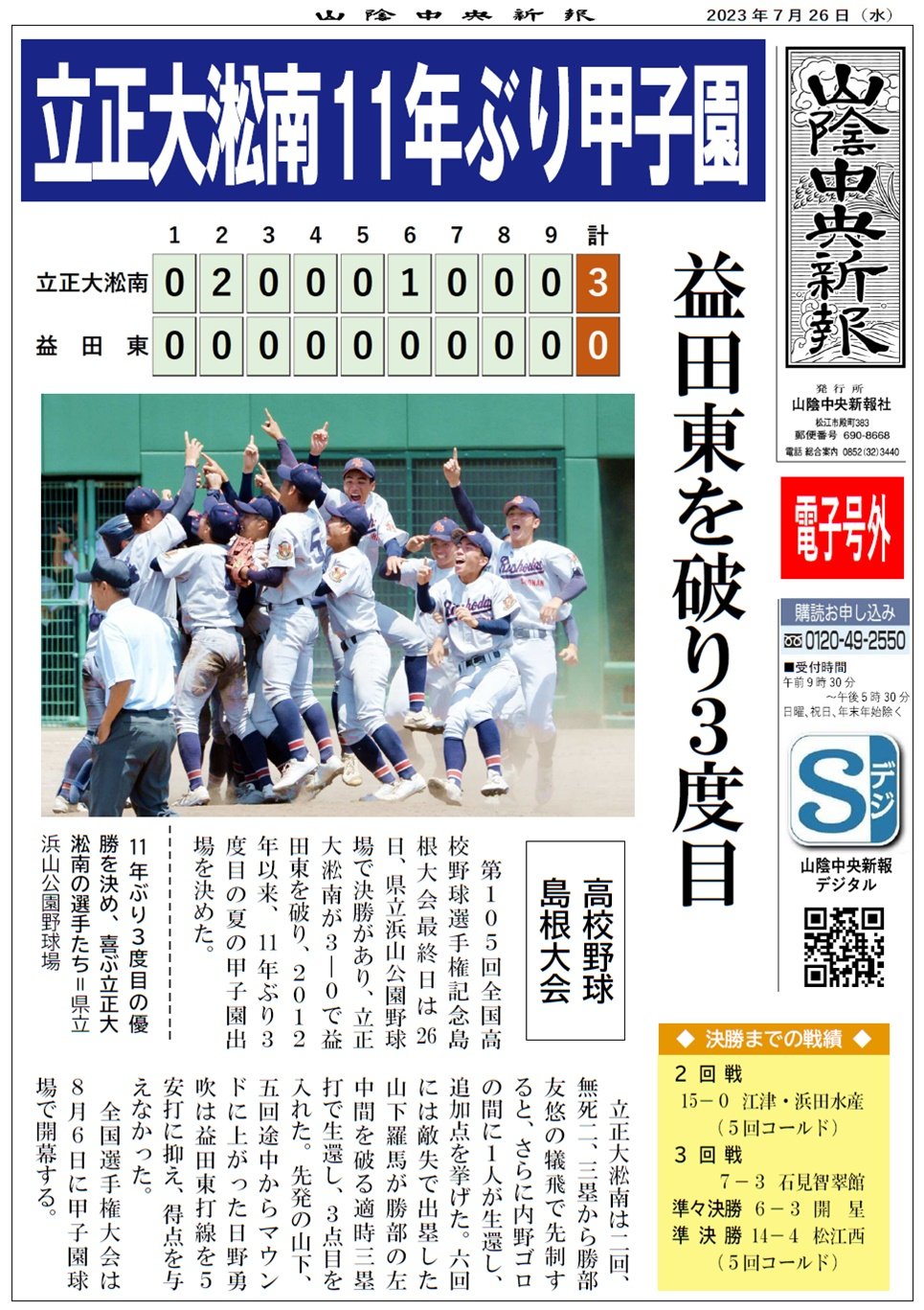 高校野球2023 【電子号外】立正大淞南 11年ぶり3度目の優勝 高校野球島根大会 山陰 スポーツ 2023/7/26 13:51 保存 第105回全国高校野球選手権記念島根大会最終日は26日、県立浜山公園野球場で決勝があり、立正大淞南が3-0で益田東を破り、2012年以来、11年ぶり3度目の夏の甲子園出場を決めた。 電子号外(pdf)はこちらから。 無料会員に登録すると 付き記事が毎月5本読める 無料会員に登録する ログインする サービス内容を確認する 保存 記事を保存する この機能は有料会員限定です。保存した記事やフォローした特集をマイページでご覧いただけます。 有料会員になる ログイン 前の記事へ 次の記事へ 高校野球2023のバックナンバー 【試合速報】米子松蔭が惜敗、山陰勢姿消す 秋の高校野球 中国地区大会第3日 大社、接戦落とす 米子松蔭が準々決勝へ 秋の中国高校野球 秋の高校野球中国地区大会 第1日 浜田 好機で一本出ず 米子北 コールド負け もっとみる 関連記事 迫る「心不全パンデミック」の危機 医療の進歩で救命の可能性向上 日頃からの医療連携体制が重要【さんいん健幸道】 2025/10/25 11:00 【動画】島根銀行・長岡一彦頭取インタビュー 創業支援、SBIグループとの連携の効果 <VISION~経営トップの針路~> 2025/10/25 11:00 【ライブ配信】準決勝・第2試合 南雲-オール東出雲 JAカップ島根県学童軟式野球 2025/10/25 10:54 【ライブ配信】準決勝・第1試合 STブルーウィングス-Kidsベースボールクラブ JAカップ島根県学童軟式野球 2025/10/25 10:44 「旅するチョウ」アサギマダラの群れが飛来 津和野 2025/10/25 04:00 特集・連載 客の前では「王子様」 「オタク趣味」は小学生の頃から コンカフェ店員の女子大生(上)〈顔なき…声〉 2025/8/12 05:00 スポーツを科学しよう<49> 栄養(17) 安易なサプリメント使用は禁物 2025/6/3 04:00 島根、鳥取の上水道料金 地域差3万3千円の謎 全地域を調査 2025/5/4 04:01 原発に向き合う・島根2号機再稼働 関係者インタビュー<下> 丸山達也 島根県知事 通常の再稼働に注力を 避難道整備 国に説明責任 2024/9/21 04:00 島根スサノオマジック 「選手のサイン入りTシャツ」プレゼント 地域住民の懸け橋になった「西田にじいろ食堂」 運営スタッフ 出雲市万田町 小林春美さん 地元で育つミライのチカラ 島根県立江津工業高校 親子で楽しくエコを学べる体験型イベント! 「こどもエコミュージアム」を9月6日(土)に松江市で開催