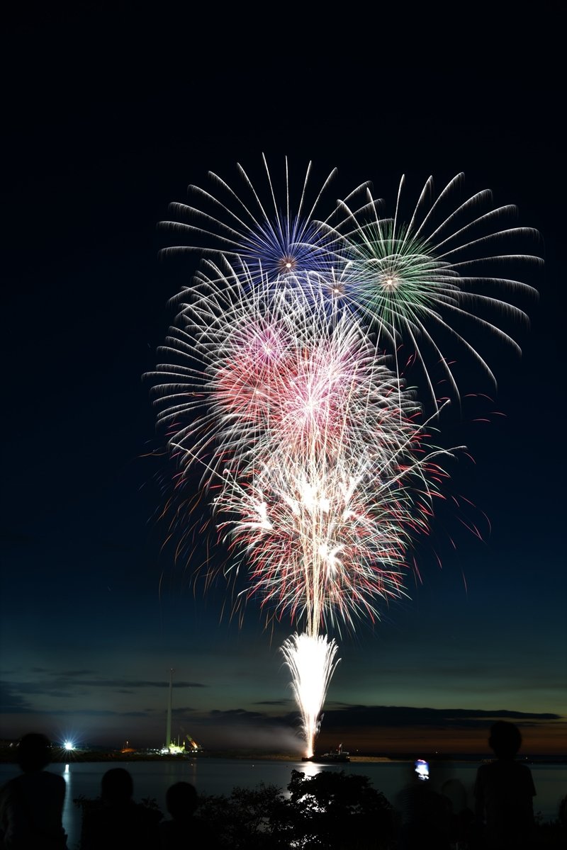 益田市の夏の風物詩「益田水郷祭」が5日夜、高津川河口河川敷(高津7丁目)であった。豊漁や海上安全を祈願する船神事「ホーランエー」とともに2100発の打ち上げ花火が夏の夜空を彩った。