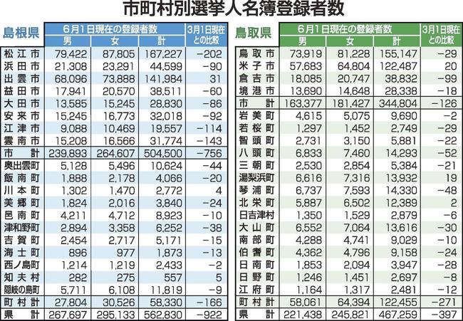 島根、鳥取両県の選挙管理委員会が3日、1日現在の選挙人名簿登録者数を発表した。3月1日現在の前回と比べ、島根は922人減の56万2830人(男26万7697人、女29万5133人)、鳥取は397人減の46万7259人(男22万1438人、女24万5821人)となった。