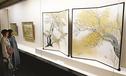 会場には50号までの作品が並び、見どころは同人の作品34点。田渕俊夫さんの「長良川心象 月光」は、岐阜市の金華山に立つ岐阜城と長良川河畔の夜景を描いた。濃い青の夜空に明るい月が映え、岐阜城と麓の現代の建物の対比が興味をかき立てる。