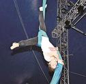 松江市学園南1丁目の旧島根県立プール跡地で開催中のポップサーカス(山陰中央新報社、TSKさんいん中央テレビ主催)のフィナーレに、壇上でウクライナ国旗を振る男性がいる。空中ブランコを担当するチャトさん(49)だ。ロシアの侵攻を受けた同国は妻の故郷で、昨年3月に家族とともに命がけで脱出。平和への強い思いを胸に宙を舞う。 (林李奈)