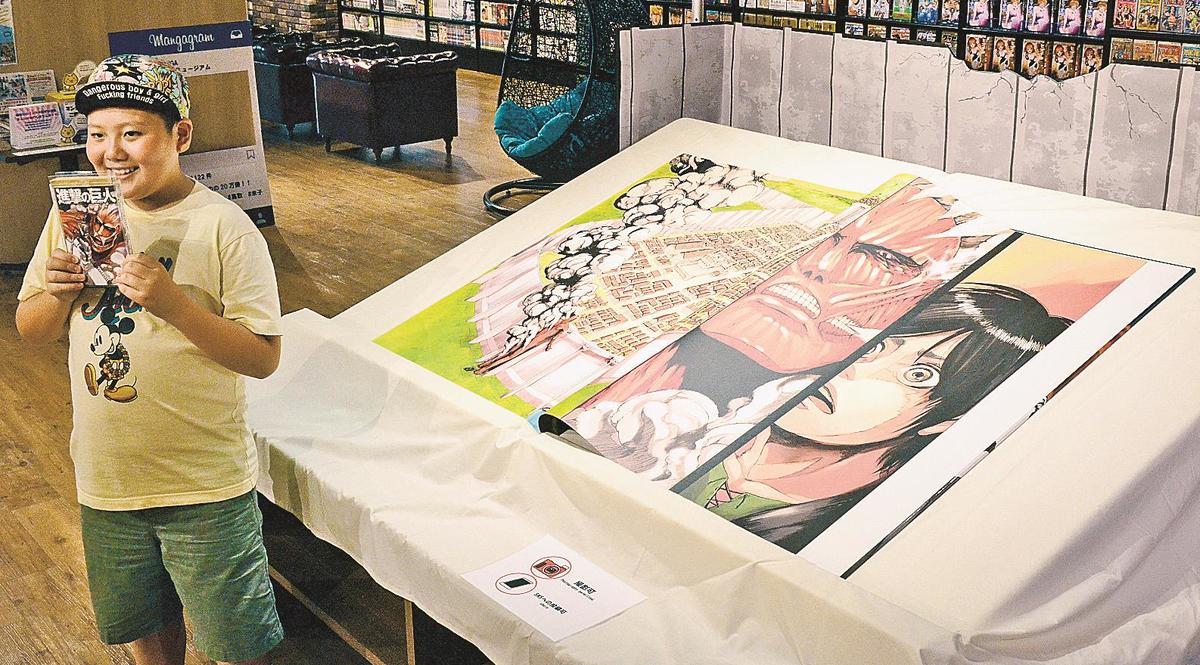 【米子】2021年4月に漫画の連載が完結した大ヒット作「進撃の巨人」の超大型コミックが4日、米子マンガミュージアム(米子市角盤町1丁目)でお披露目された。物語の鍵を握る「巨人」が読むことを想定した巨大サイズで、ギネス世界記録にも認定。同館の新たな目玉となりそうだ。