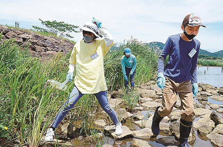この日は、結団式に続いて漂着物を調査。子どもたちは観察指導員の岩西哲さん(44)らから、多様な生物がすむ汽水湖の特徴について説明を受けた後、湖岸を歩き、ペットボトルやレジ袋、流木などを拾い集めた。予想以上にペットボトルが多いことが分かり、出雲市立荘原小6年の今岡蓮君(11)は「小さなプラスチックを鳥や魚が食べないように、きれいにしないといけない」と話した。