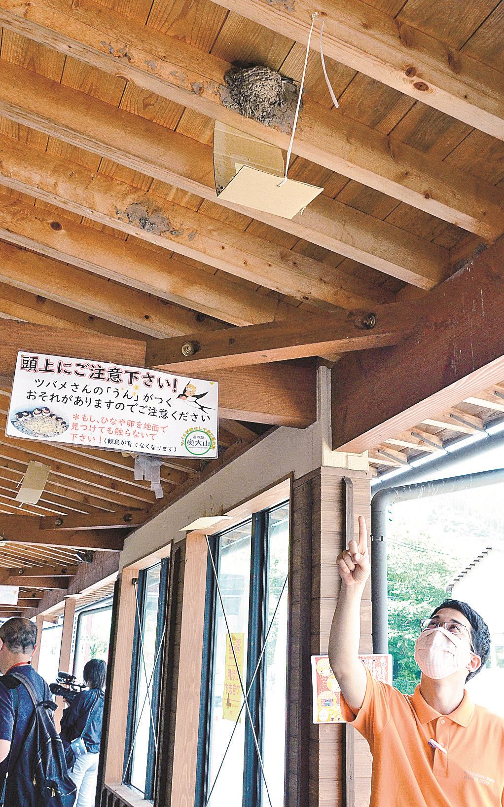 小まめに掃除をするほか、頭上から落ちるふんに注意するようポスターで来訪者に呼び掛けた。さらに巣からの落下物をカバーできるよう、天井から段ボール製の「ふんよけ」をつり下げた。つり下げる糸をうまく張ることで、幼鳥を狙うカラスが近寄りづらくなった。見守り対策が奏功し、今年は施設内の巣の数が約50個にも及んだ。