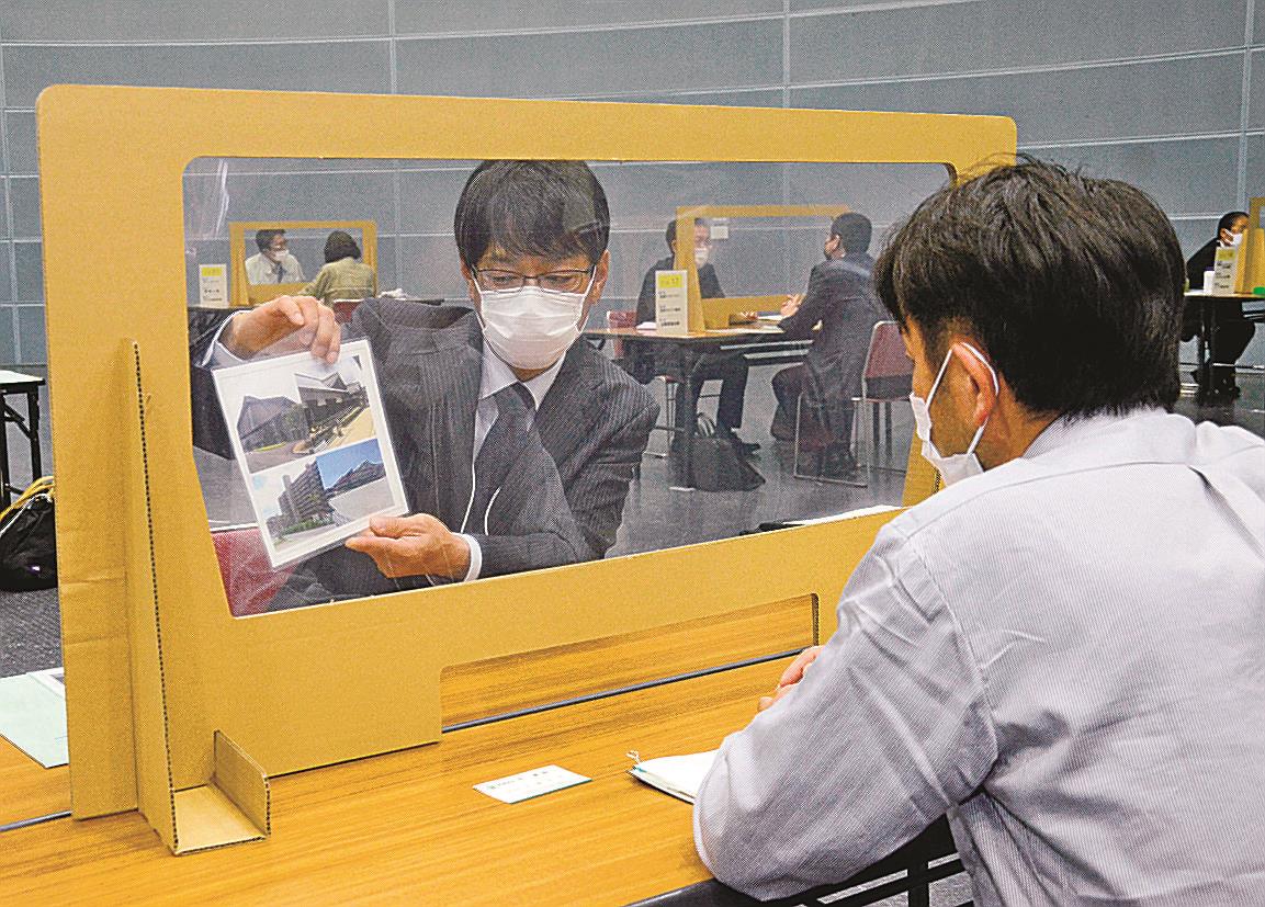 高校の進路指導担当者が企業のブースを回り、詳しい業務内容や求められる人物像などを質問。企業側は定着率の高さや職場環境などをアピールした。