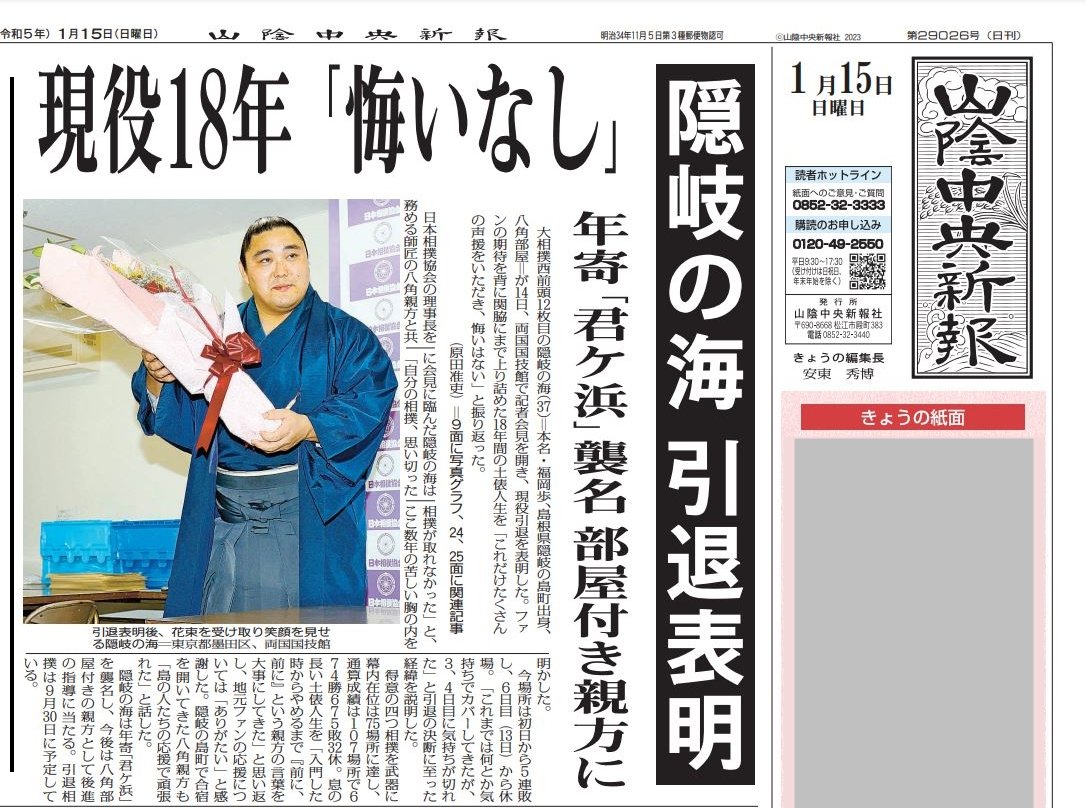 1月に18年間の現役生活に幕を下ろした、島根県隠岐の島町出身の年寄・君ケ浜(38)=大相撲元関脇・隠岐の海、本名・福岡歩=が9月30日に行う「隠岐の海引退君ケ浜襲名披露大相撲(断髪式)」(東京・両国国技館)を前に、これまでの栄光の歩みを、写真と紙面で振り返る。