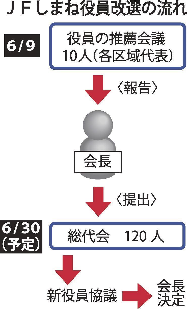 松江市御手船場町のJFしまね本所であった推薦会議では、浜田、大社など県内10区域から選ばれた委員計10人が、岸会長を含む20人の役員案と、外した同数の案を協議した。関係者によると、無記名投票の結果5対5となり、10人の中から選ばれた議長が、岸会長を外した案を選択した。