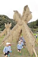 【益田】チューリップが取り持つ縁で益田市本俣賀町の住民と交流する山口県萩市の主婦手塚東美枝(とみえ)さん(81)が6日、益田市を訪れ、住民が設置したヨズクハデをバックに音楽の演奏会を開き、園児らと触れ合った。