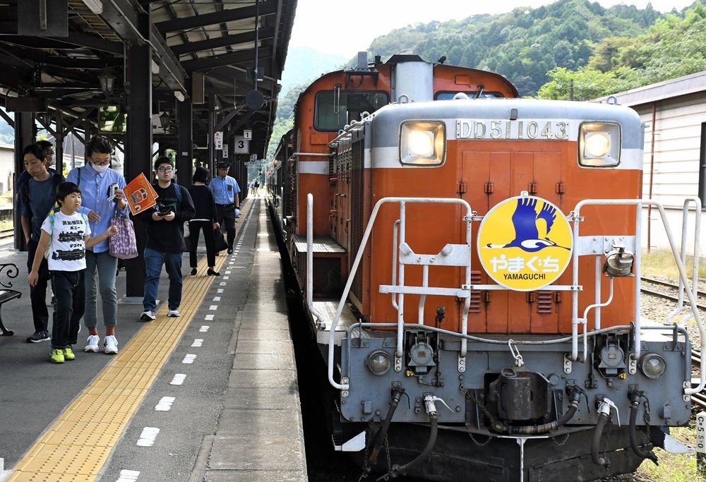 午後1時ごろ、ディーゼル機関車に引っ張られた5両編成の列車が、島根県津和野町後田の津和野駅に到着。九州など県外から来た乗客が、駅のホームで列車のヘッドマークを前に写真を撮ったり、城下町の風情が残る津和野の町並みの散策を楽しんだりした。
