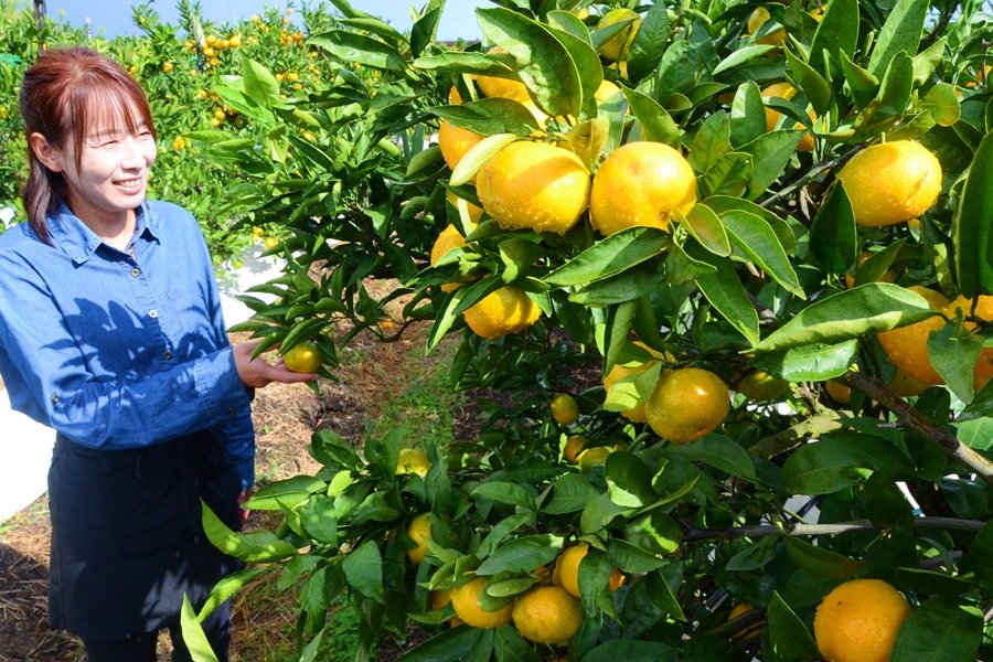 農園主の佐伯勝美さん(71)が2014年に開いたみかん園は極早生(わせ)の「日南(ひな)の姫」、早生の「日南(にちなん)1号」など4品種計170本が植わる。今季は、従来の海藻やカキ殻に加え、魚粉を肥料に導入したこともあり、生育がよく、例年にない出来栄えだという。植えた木が適度に育ったことも相まって「木が元気な時期に入り、ミカンに甘みだけでなく、味わいが出てきた」と佐伯さんは説く。