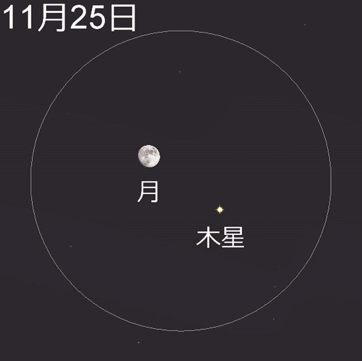 もし天気が悪くて見逃(みのが)したとしても、来月11月25日にもまた月が木星の近くにやってきます。同じ午後7時でしたら真東よりもやや南寄(よ)りに、木星と満月に少し足りない月が前月よりももっと接近して見えます。さらに翌月(よくげつ)の12月22日にも、その時刻(じこく)には南の空高くで、今度は半月よりやや太った卵形(たまごがた)の月が木星に寄り添(よ)います。