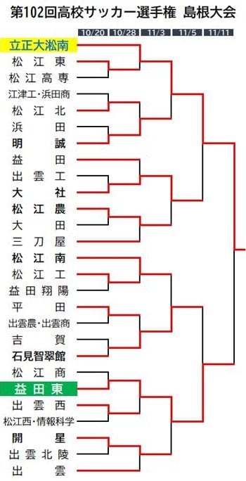 第102回全国高校サッカー選手権島根県大会最終日は11日、県立浜山公園陸上競技場で決勝があり、立正大淞南が益田東を2-0で下して、2年連続20度目の優勝を果たした。