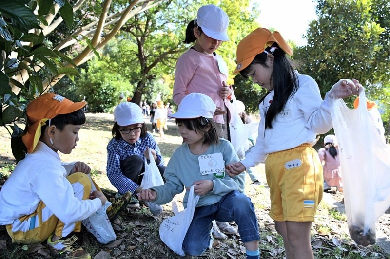 参加者は川津小学校1年の102人と川津幼稚園の26人、育英北幼稚園の28人。保育や小学校の先生を目指す高校生4人と一緒に、枝を使って落ち葉を払ったり、土を掘り出したりして、ドングリや落ち葉、小さな虫をビニール袋に集めた。