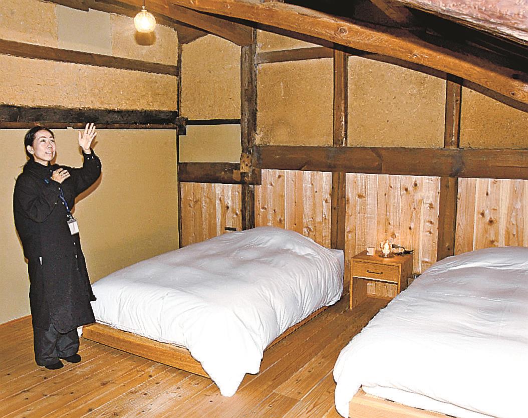 江戸から明治にかけ北前船の寄港地として栄えた出雲市大社町鷺浦で、かつて船宿だった古民家を改修した宿泊施設が14日、オープンした。梁(はり)などが残る室内には地元作家の生け花や家具も配置し、都会地やインバウンド(訪日客)を狙い、滞在型の宿として売り出す。