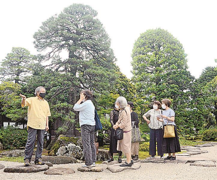この日は、参加者が伝承館の庭を散策しながら、短冊石や飛び石、灯籠などを直接楽しんだ。(松本直也)
