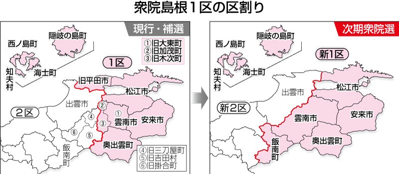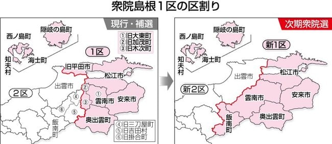 2000年の国勢調査を受け、定数が3から2に減り、02年に現行の1、2区になった。市町村合併を経て出雲、雲南両市は選挙区が分断しており、次期衆院選から、現行1区の旧平田市(現出雲市)が2区、現行2区の旧三刀屋、掛合両町、旧吉田村(いずれも現雲南市)、旧頓原、赤来両町(いずれも現飯南町)が1区に移る。