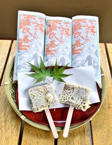 出来たてを食べながら散策してもらおうと、源氏巻1本(長さ約20センチ)を3等分したサイズを串に刺して提供する。1個税込み130円。今春に発売し、現在1日80~100個を売り上げる。