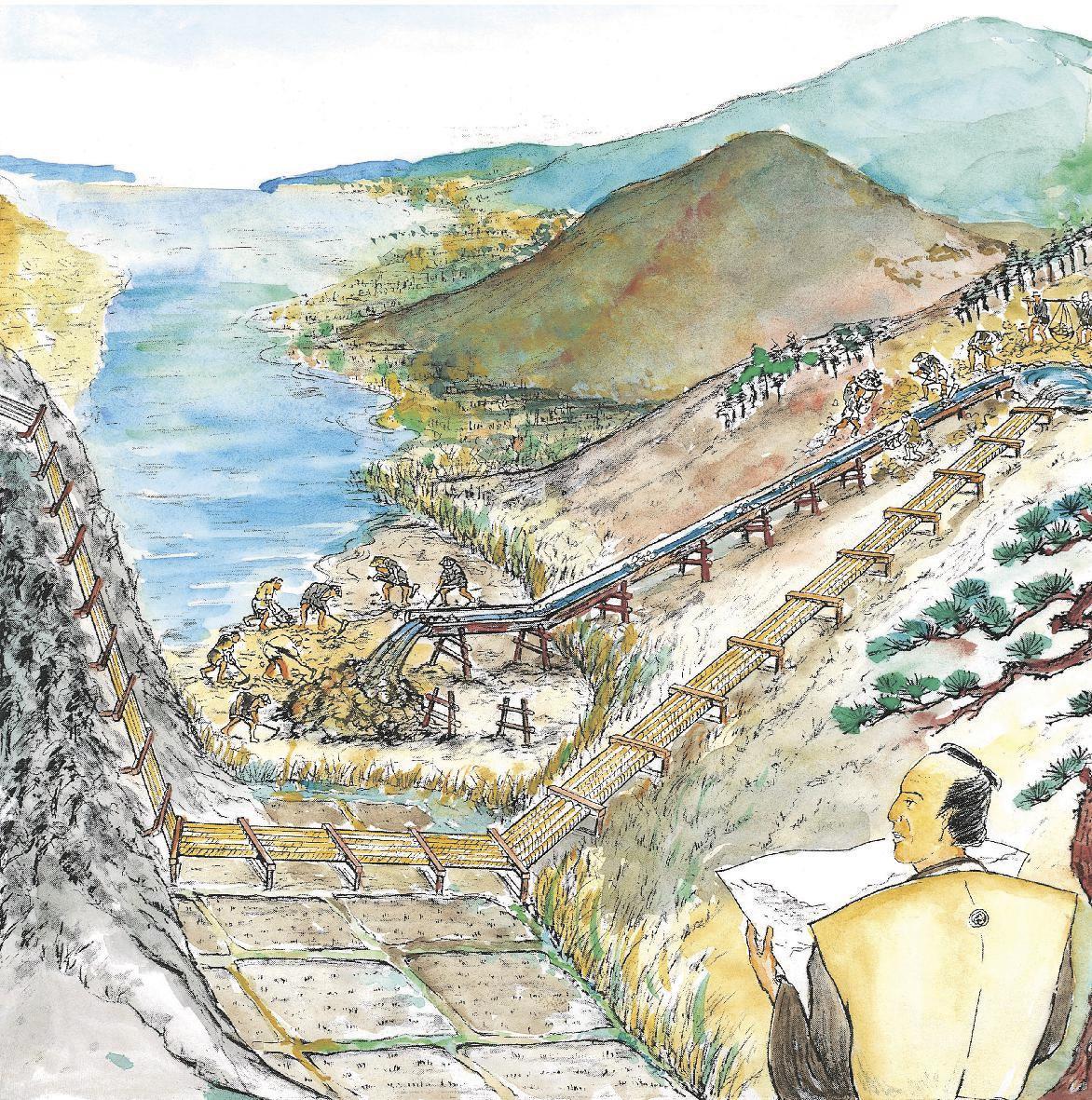 工事では山の土砂(どしゃ)を効率(こうりつ)よく池へ運ぶため、たたら製鉄で砂鉄(さてつ)を採(と)る「鉄穴(かんな)流(なが)し」を応用(おうよう)しました。池から8・7キロ離(はな)れた高清水(たかしみず)神社(現・松江市東出雲(ひがしいずも)町下意東(しもいとう))のわき水と羽入川(はにゅうがわ)の水を利用。山や谷に水路を通して泥水(どろみず)を池に送り、埋めていきました。