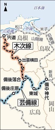 一方、備後落合で芸備線と接続する木次線の22年度の輸送密度は、宍道-出雲横田の237人に対し、出雲横田-備後落合は管内で2番目に少ない54人。