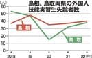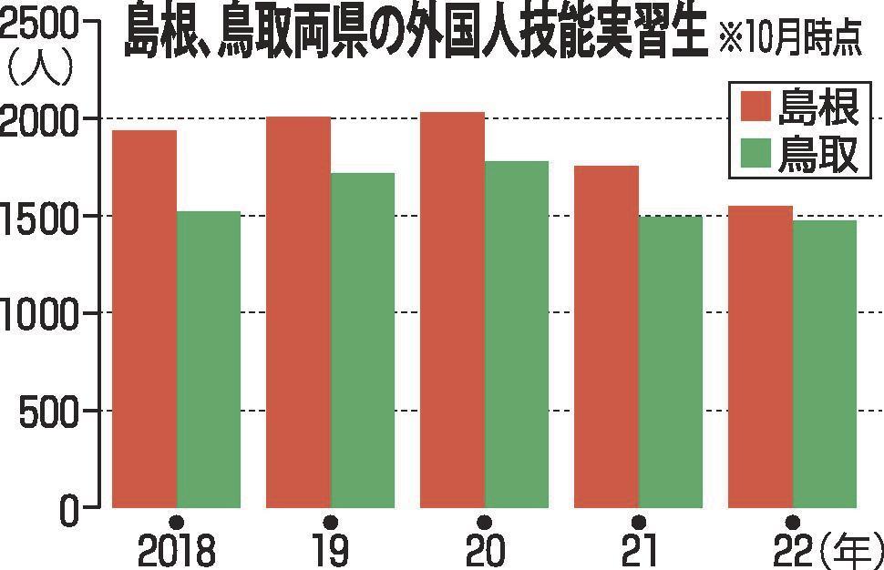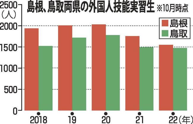 島根、鳥取両労働局によると、22年の実習生数は島根1549人、鳥取1474人。国籍別はいずれもベトナムが最多で島根717人、鳥取847人、中国が島根232人、鳥取166人で続いた。業種別は両県とも製造業が最多で島根980人、鳥取967人、建設業が島根252人、鳥取161人などだった。