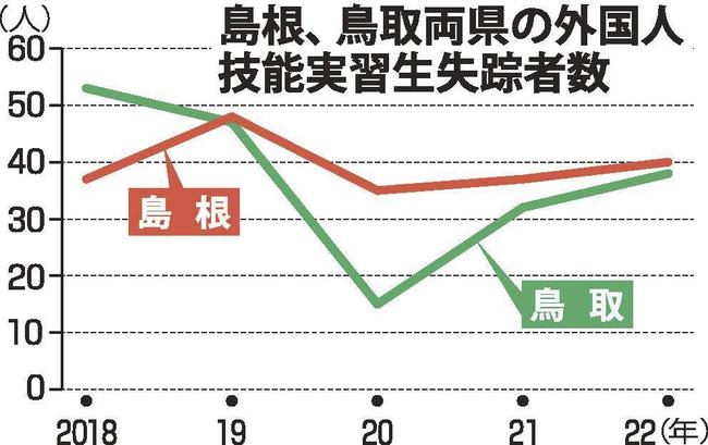 出入国在留管理庁によると、島根は18~22年に毎年30人以上が失踪し、最多は19年の48人で、22年は40人だった。鳥取で最も多かったのは18年の53人で、22年は38人となった。