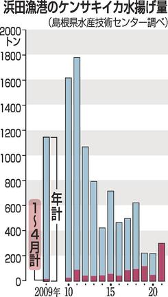 島根県水産技術センターや浜田市のデータで、11年は1784トンで水揚げ額は9億円を超えたが、その後は減少し、19年は225トン(2億1千万円)、20年は220トン(2億3千万円)と不漁にあえいでいた。