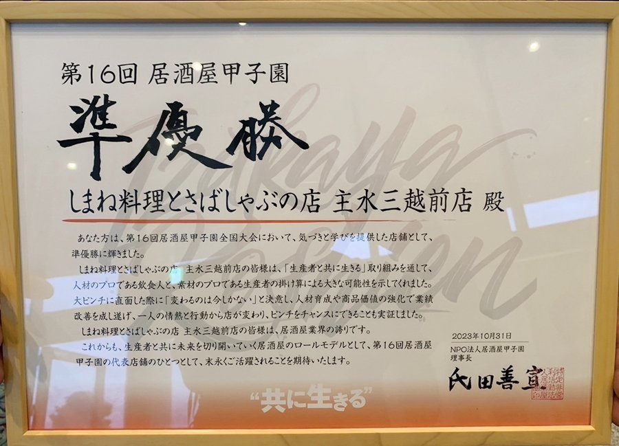 全国の居酒屋ナンバーワンを決める「第16回居酒屋甲子園」で、島根の地物を都内で提供する「しまね料理とさばしゃぶの店 主水(もんど)」(東京都千代田区)が準グランプリを獲得した。エントリー総数が1000店を超す中で、銀メダルに輝いた主水の秘密に迫った。