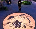 鬼太郎とねずみ男の石像は観光客に人気の撮影スポット。しめ縄で飾られると、県外客らが記念撮影をしていた。