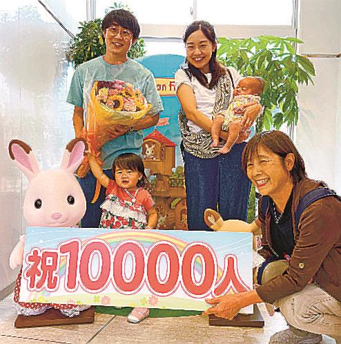 花束と記念品を受け取った山下さんは「子どもが動物や人形が大好きなので、立ち寄った。まさか1万人目に当たるなんてびっくり」と大喜びだった。