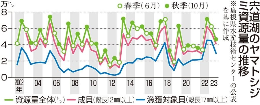 宍道湖のヤマトシジミの資源量が2023年10月時点で、4万6652トン(598億個)と推定され、過去3番目に多かった前年同期に比べて35%減だった。調査した島根県は、猛暑による湖底の貧酸素化が影響していると分析。漁獲対象となる殻の長さ17ミリ以上の資源量は比較的高い水準だが、17ミリ未満の小型成貝や未成貝が低迷しており、中長期的な動向は楽観視できない状況となっている。