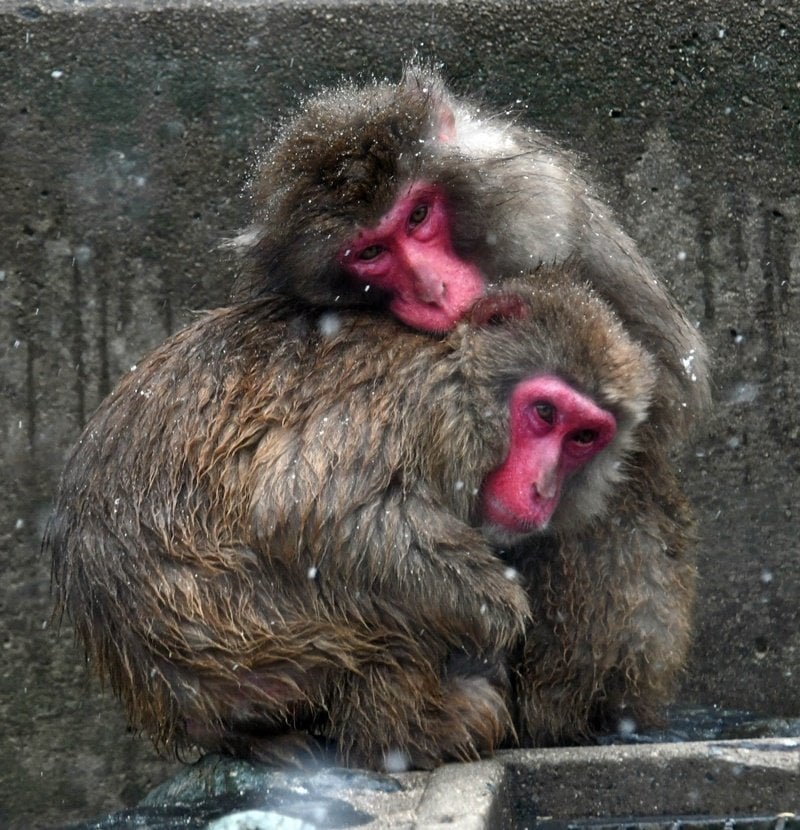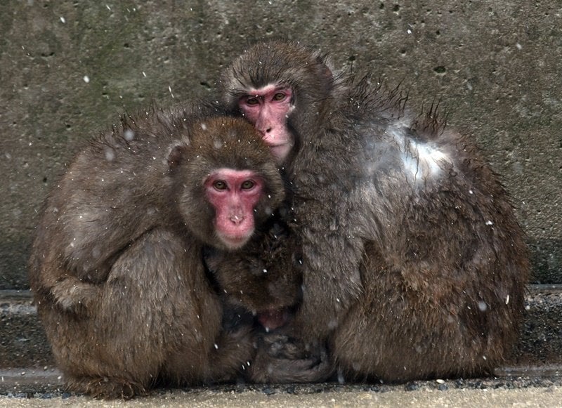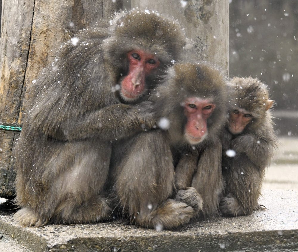 猿が島では46匹を飼育する。この日は午前9時に氷点下0・5度を記録し、雪が吹き付ける中、ふかふかの冬毛に覆われたサル同士が体を寄せ合い、3~5匹が集まって暖を取って寒さに耐えた。