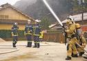 訓練は庫裏から出火して本堂に燃え移ったとの想定で実施した。火に気付いた地域住民が敷地内のある放水銃を使って消火し、通報を受けて駆け付けた益田広域消防本部の職員らが素早くホースを延ばして放水した。