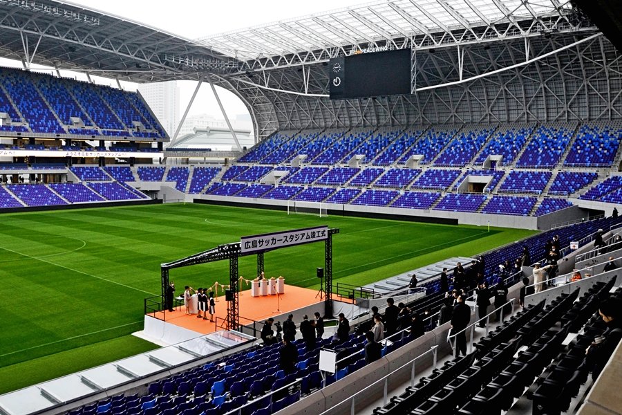 J1サンフレッチェ広島の新本拠地「エディオンピースウイング広島」が完成し31日、広島市中区の現地で式典があった。松井一実広島市長ら関係者240人が「まちなかスタジアム」の完成を祝った。
