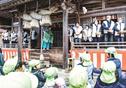 4年ぶりとなる節分祭の豆まきが3日、松江市八雲町熊野の熊野大社であり、約1000人の参拝客が無病息災を願い、雪の残る境内で福豆と福餅の入った小袋を取り合い手を伸ばした。(林李奈)