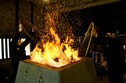 炉内の最高温度は1000度を超える。養成員によって操業に伴い薄くなった炉壁が崩されると火の粉が高く舞い、熱気が周辺に広がるとともに、炎をまとった赤黒いけらが姿を見せた。見学者が「おぉ」と感嘆の声を上げる中、養成員が土ぼこりと汗にまみれながら、大かぎや小かぎといった道具を使い、崩した炉壁をかき出していった。