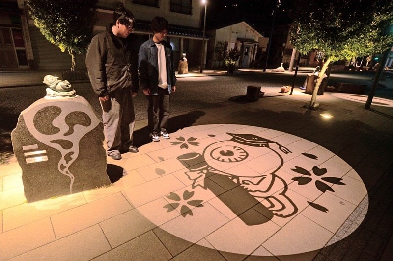 境港市の水木しげるロードで、妖怪影絵の春休みバージョン6点の公開が始まった。3月28日までの期間限定で「春」を伝え、177体の妖怪ブロンズ像とともに観光客を楽しませる。