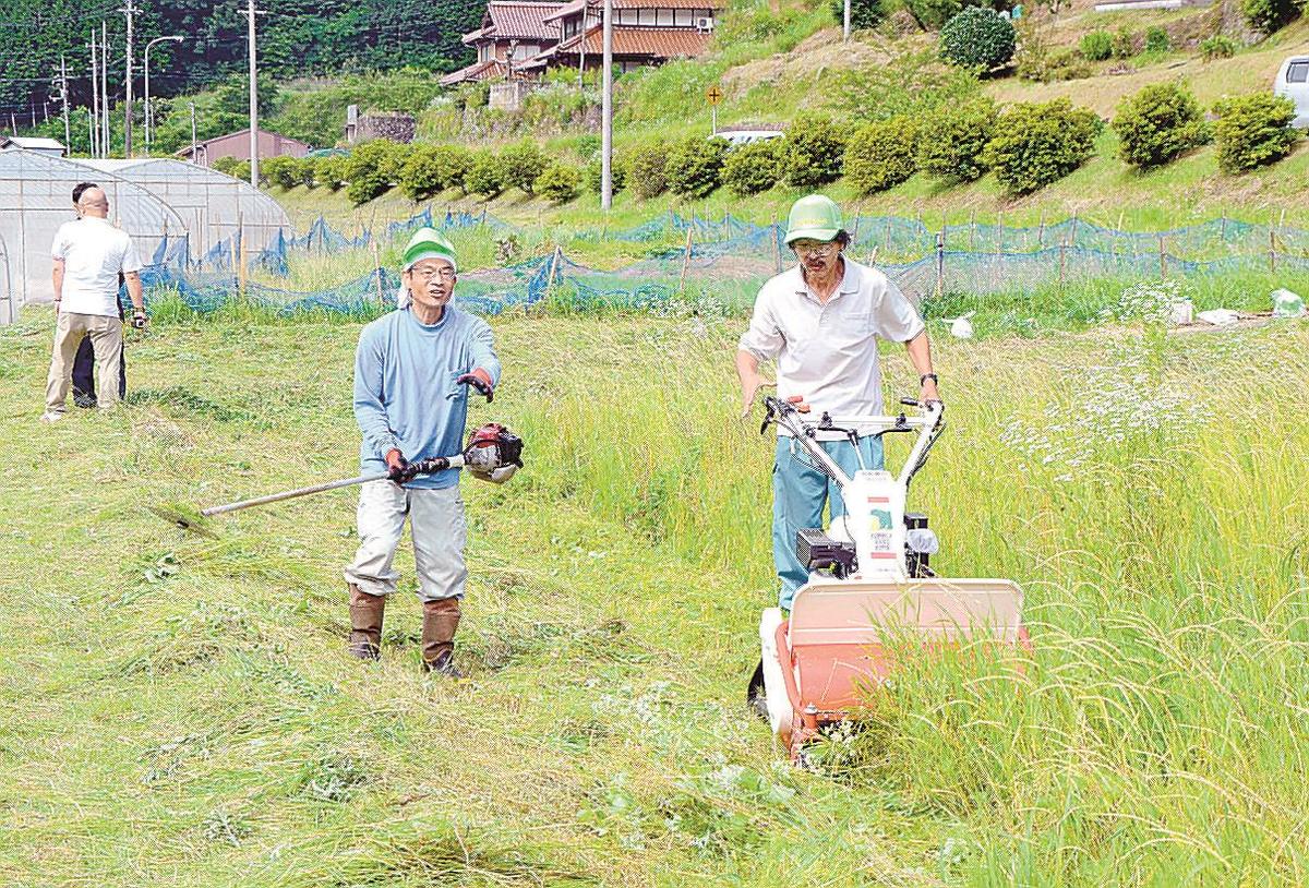 22日には高齢住民の依頼を受け、メンバー6人が同町木都賀の休耕田に集まった。胸丈まで茂った雑草を手際よく刈り、住民の自宅周辺や道路脇の斜面まであっという間に除草した。