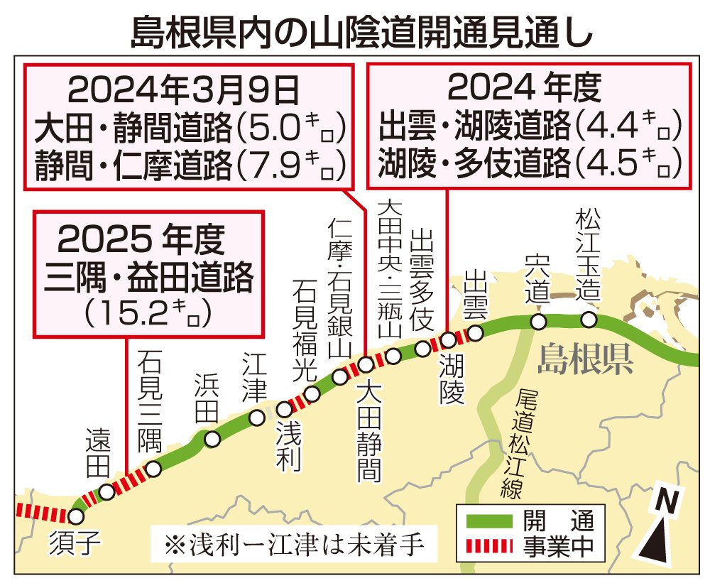 大田市西部の仁摩町から東進する山陰道静間・仁摩道路(同7・9キロ)と大田・静間道路(5・0キロ)が9日に開通する。1年後には、出雲市内の出雲インターチェンジ(IC)ー出雲多伎ICの9・9キロも開通する予定で、鳥取県中部から大田市までの約150キロがつながる。災害、急病時の備えの強化、経済圏の拡大など生活を下支えする重要なインフラの延伸で地域がどう変わるのか、期待と課題を追った。
