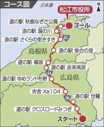 広島県尾道市から松江市までの192キロ。国道54号などの沿線地域活性化につなげようと、コース上の道の駅などでつくる実行委員会が企画した。当初は昨年6月に予定していたが、新型コロナウイルスの感染拡大の影響で中止した。