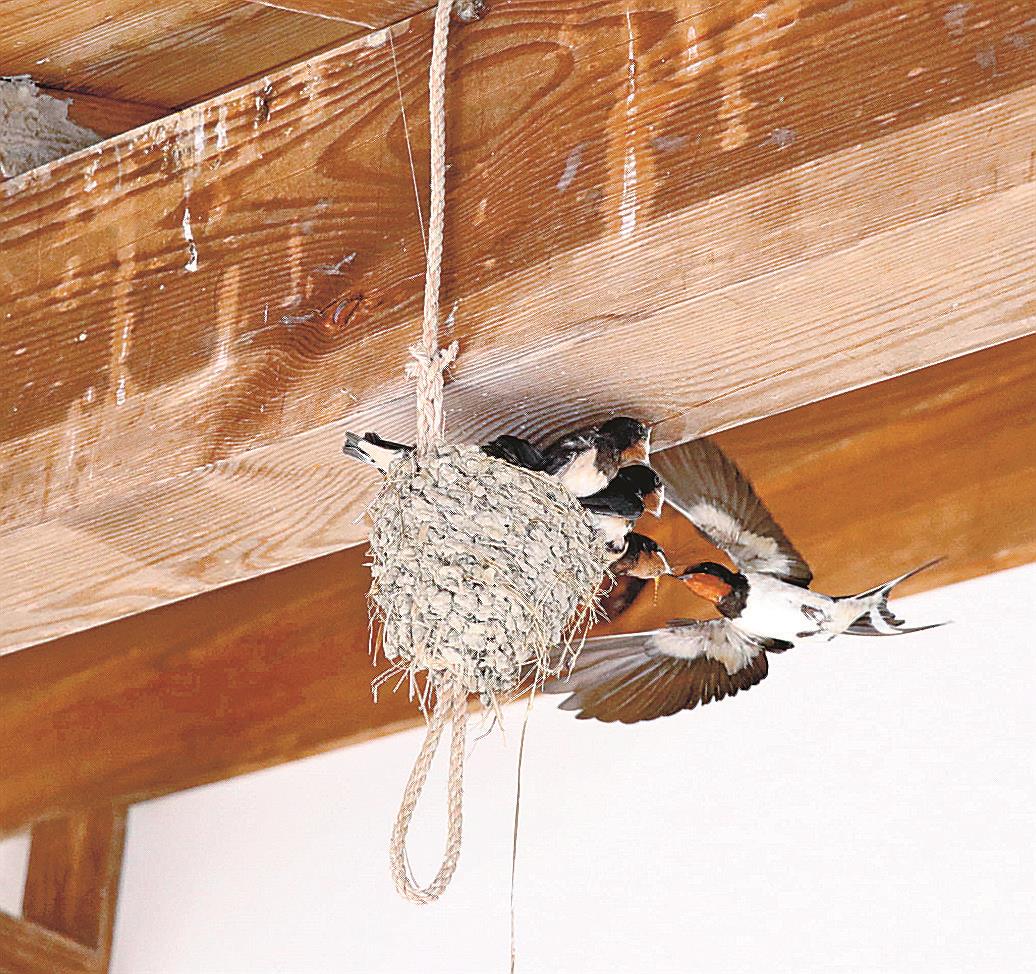 益田市戸田町の農業、宮内真樹さん(78)方の納屋で、軒下につるされたロープにツバメが巣を作った。5羽のひながおり、「揺り籠のようでかわいらしい」と見る人の気持ちを和ませている。
