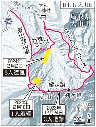 鳥取県大山町の大山(1729メートル)で福岡市の男性3人が雪崩に巻き込まれ、このうち2人が行方不明になった遭難から9日で1週間となった。県警などによる捜索が続くが、発見に至っていない。今季起きた3件の遭難は、大山特有の天候の急変に起因しており、山岳関係者は気象状況の把握や万全な装備での入山を呼びかける。
