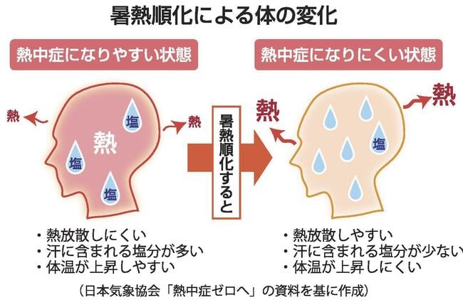 同協会「熱中症ゼロへ」プロジェクトによると、暑熱順化は、暑くなる前に適度な運動をして体温を上げ、体を暑さに慣らすこと。熱中症対策の一つだが、まだ広くは知られていない。